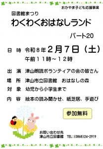 2026/2/7 津山市立図書館 こども向け わくわくおはなしランド パート20 日時 令和8年2月7日(土曜日)午前11時~12時 出演 津山朗読ボランティアの会の皆さん 場所 津山市立図書館 おはなしの森 対象 幼児から小学生まで 内容 絵本の読み聞かせ、紙芝居、手遊び BACK TO LIST