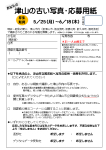 内容 津山市内の昔の写真を募集します。応募用紙を添えて図書館まで。1人10枚まで