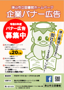 財源の確保、施設利用者のサービスの維持向上を図ることを目的として、津山市立図書館で作成しているホームページへ掲載する広告を募集します。